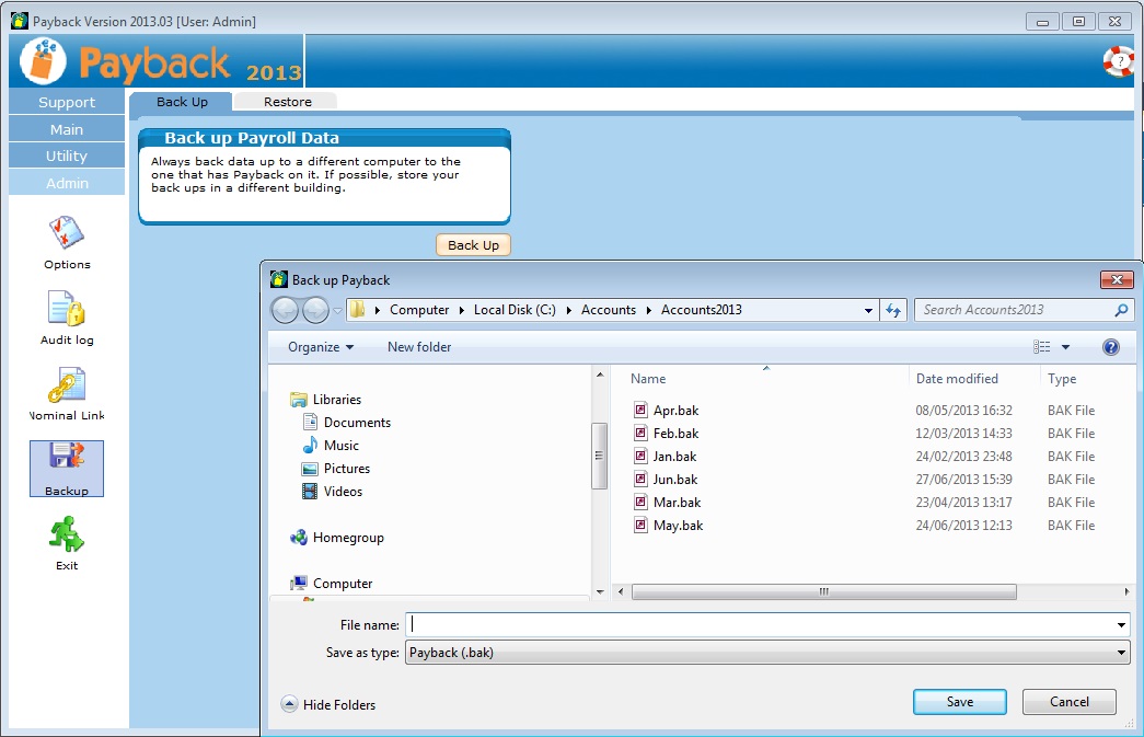 We strongly advise users to make frequent back ups of their payroll data. A back up should always be made before downloading and installing a Payback update. This is because if the upgrade process does not pick up your data, you will be able to easily restore your payroll data from the back up you made. You will not have to go searching for your data. Base your back up schedule on much much data you are prepared to lose. For example, if you can live with losing a full month's data, then back up once a month. We often get support requests from customers where their hard drives have failed, so data loss is a very real scenario. Save a copy of your backup on a separate hard drive, preferably in the cloud (like dropbox). Ideally, backups should be stored in a separate building. Note that it is not possible to open or view your back up file by double clicking it in Windows. Back up files can only be restored in Payback. |