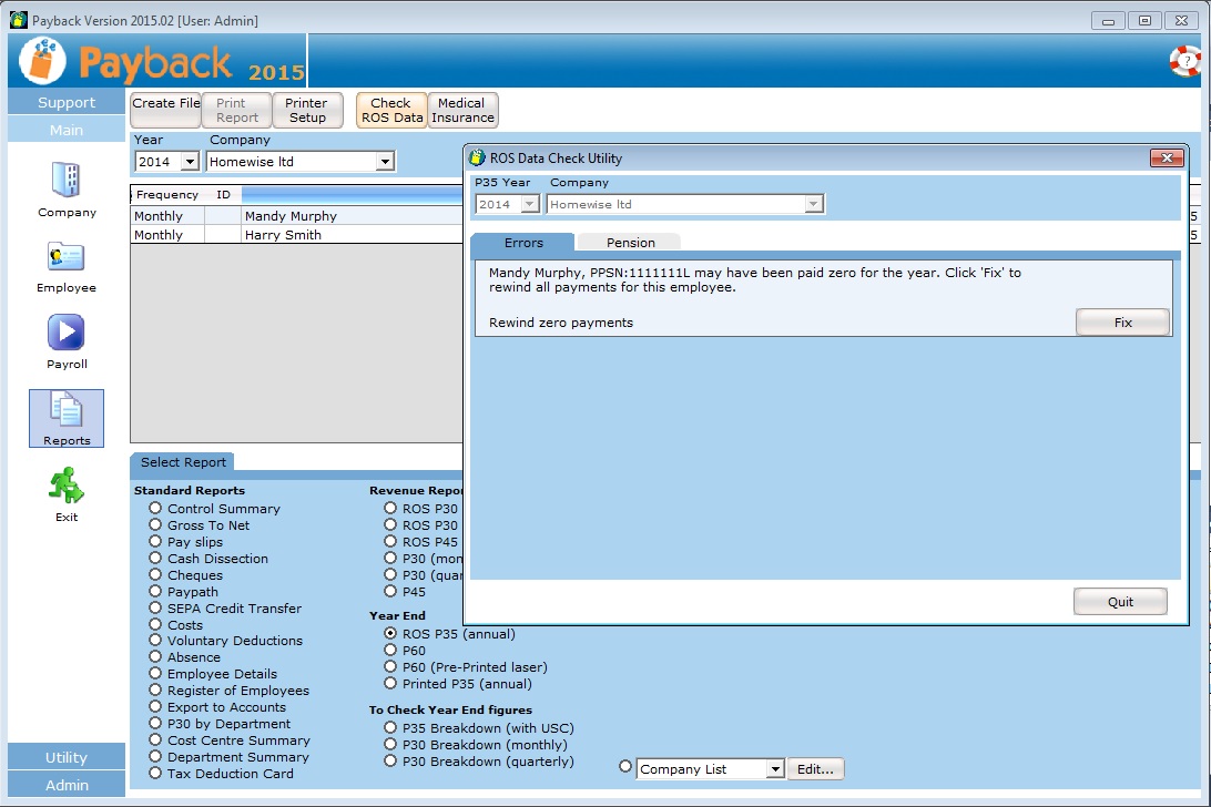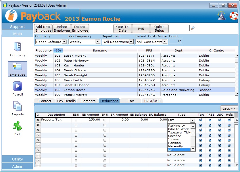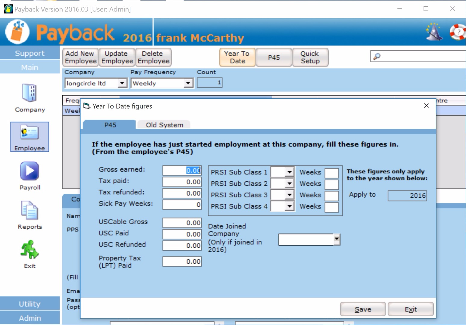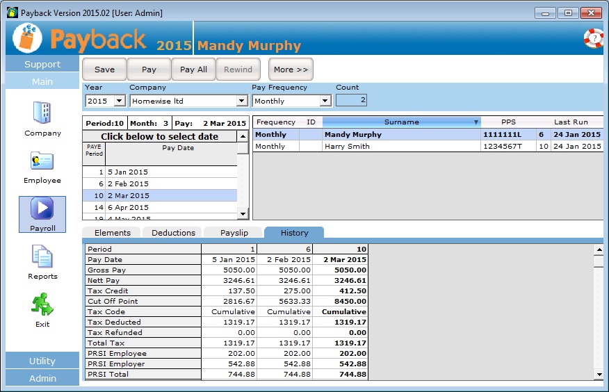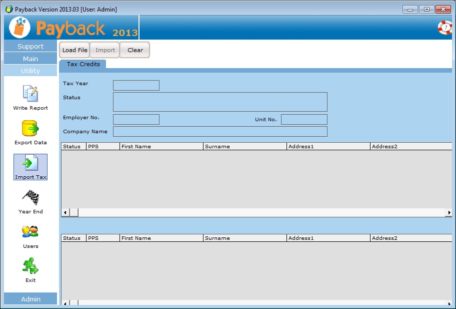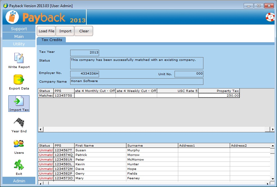 Step 2: Open Payback and click on 'Utility' on the menu at the left, and then select the 'Import Tax' icon. The P2C file import screen will appear. Step 3: Click 'Load File' at the top of the screen and select the P2C file you downloaded from ROS in step 1. Check the data in the grids, and if you are happy, click the 'Import' button. Make sure that the company has been successfully matched before importing the data. NOTE: Payback matches P2C data using: - Employer No. (Details tab in Company Screen) - PPS No. (Contact tab in Employee Screen) Please make sure that you have entered these correctly before importing P2C files. If you have not entered an employer number for your existing companies, or have entered it incorrectly, then Payback will not be able to match up your data. If you continue with the P2C import, then a duplicate company will be created. If you have not entered PPSNs for any of your employees, or they are incorrect, then (like company, above) Payback will not be able to match the employees up to the P2C data. If you continue with the import then duplicate employees will be set up. If you find that duplicate employees have been set up, these can be deleted by following these instructions:http://www.payback.ie/phpBB3/viewtopic.php?f=6&t=3 Duplicate companies can be deleted following these instructions: http://www.payback.ie/phpBB3/viewtopic.php?f=6&t=420 |