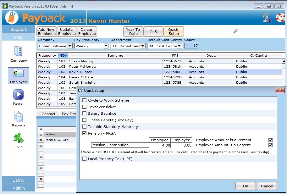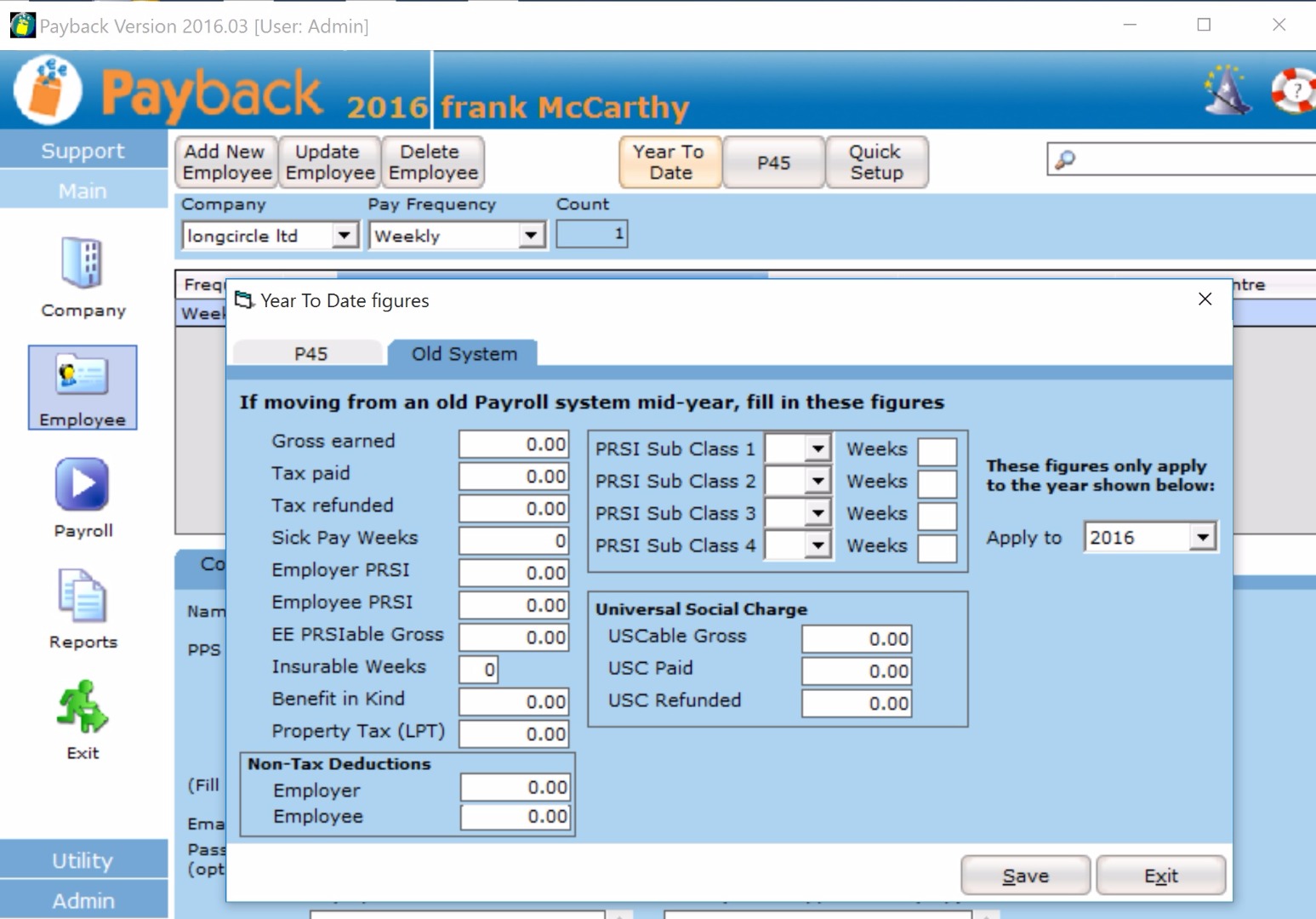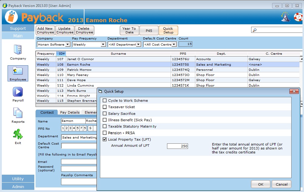 You may also notice that employees who are paid less than €10,036 are sometimes liable to USC. The ceiling for USC exemption has risen from €4,004 to €10,036 for 2012. However Payback does not automatically apply this exemption. It is not a bug, this is by design. Revenue have advised us that only the rates as advised on the P2C (Tax credits certificate) should be used. Users should not apply exemptions or reduced rates (Medical card holders etc) without a valid P2C. The onus is on the employee/pensioner (not the employer), to advise Revenue if their annual earnings will exceed the exemption threshold. We understand that this will probably cause problems for employers. We have provided the facility for employers to make employees USC exempt. To make an employee USC exempt. |