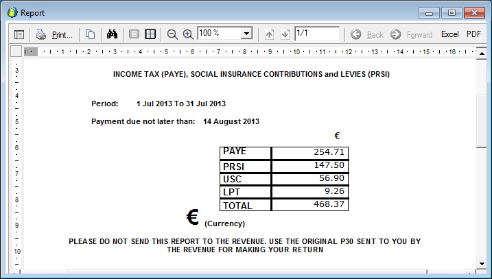Those differences are due to the way the rounding works. The P35 report rounds down the figures to the nearest Euro for each employee. Using the P35 Breakdown report, the tax from the P35 is 10477. If you include the cents for all payments, it is 10482.44 For the totals at the bottom, each employee's tax and prsi is rounded down and totalled. The P35 report does not have cent for each employee Eg, for two employees |