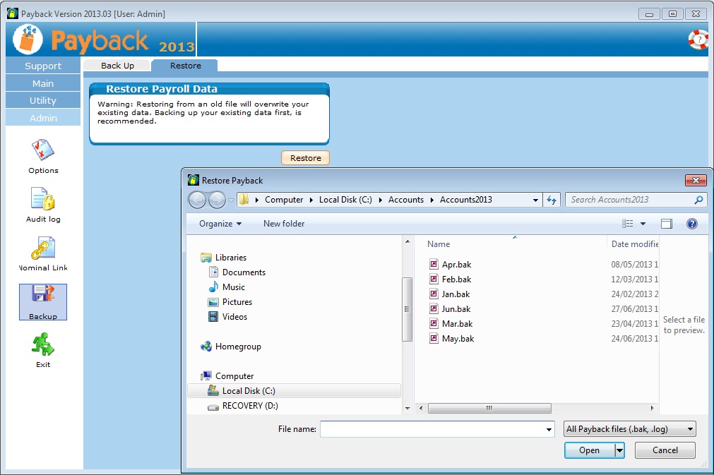 Step 1: Click 'Admin', This is at the bottom left of the screen Step 2: Click the 'Back up' icon - the Back up screen will appear Step 3: Click the 'Restore' tab, and then the 'Restore' button. Step 4: You will be asked for a filename to restore. Step 5: Please wait until the file is restored. Payback will close when the file is restored. |