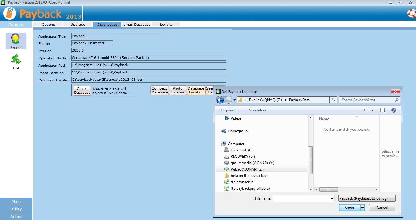 Have you, or someone else, changed the database location within Payback? You can change the database location by selecting 'Admin' on the left and select the 'Support' icon. Click the 'Diagnotics' tab. Clicking the 'Database Location' button will allow you to change the location that Payback uses for the database. |