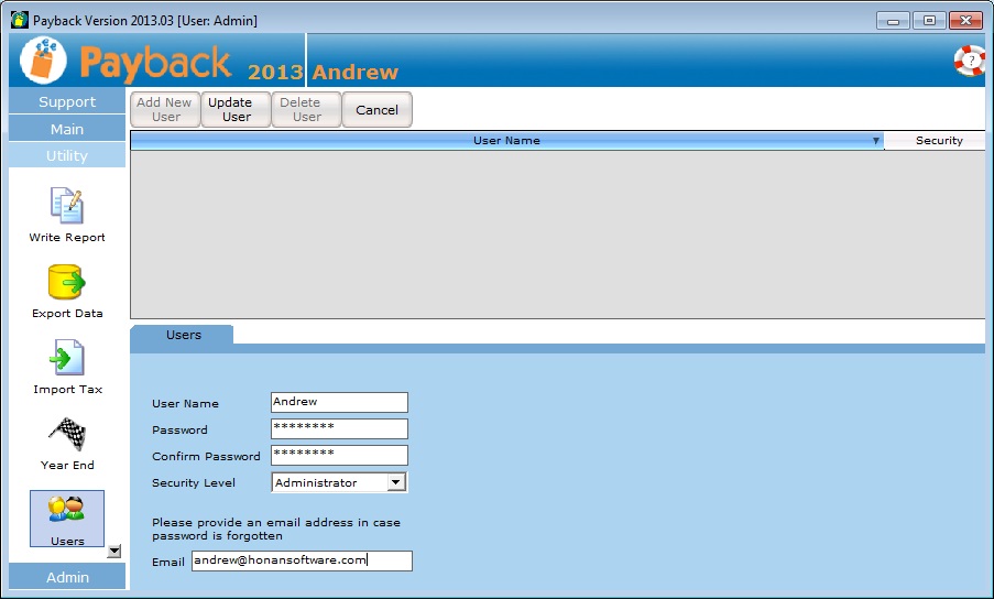 Step 3: Click 'Add New User' button at the top of the screen. Step 4: Enter a user name and password that you will remember. Step 5: Enter the same password into the confirm password box (This is to ensure you have not mis-typed the password) Step 6: Select the security level. The most common one to select here is 'Administrator'. You must have at least one administrator set up in Payback. Step 7: Type your email address. If you forget your password, then you'll be able to get it sent to this email address. Step 8: Click 'Update User' at the top of the screen. |