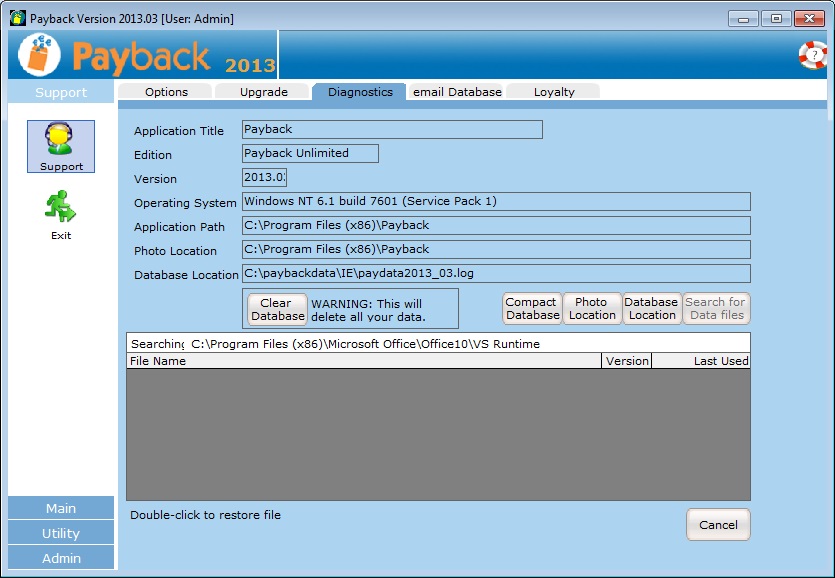 Step 1: Click 'Support' in the menu at the left, then click the 'Support' icon. The Support screen should appear. Step 2: Select the 'Diagnostics' tab. Step 3: Click the 'Search for datafiles' button. Step 4: The grid will fill with all your old Payback databases. It may take some time to completely search your hard disk and find all the files, so please be patient while this process completes. Step 5: You will need to select one of these databases and restore it. Check the 'Last Used Date' to find the latest one. The version number should be the version you have just upgraded from (eg, the version number should be 2013.02 if upgrading from version 2013.02 to 2013.03) (Do not select the Red file - this is your current, empty database) Step 6: Double click the file you wish to restore, and restart Payback. Step 7: Check your data. If it is too old, or the wrong data, select a different file (step 5) to restore. |