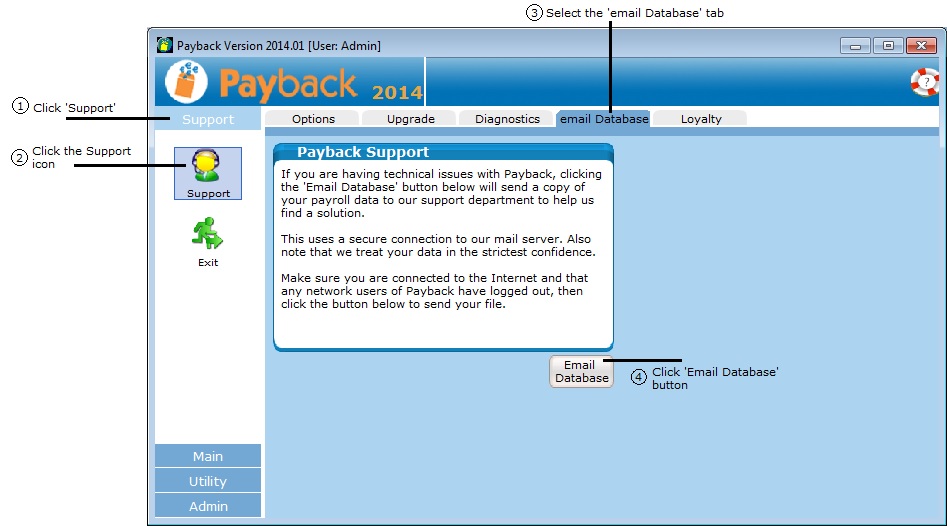 Sometimes we may have to see your data in order to resolve your support queries. You can send us your data by following the instructions below. (Note that your computer should be connected to the internet for this to work) Please also include any relevent information, like Company and Employee names.