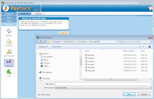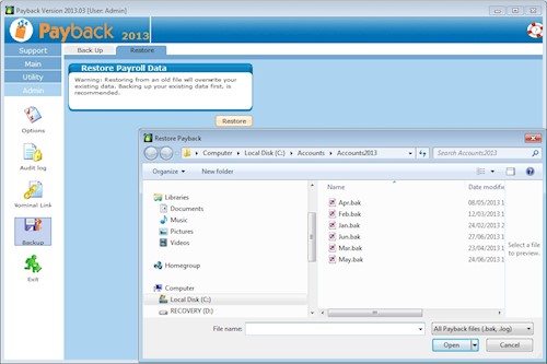 Note that it is not possible to open or view your back up file by double clicking it in Windows. Back up files can only be restored in Payback.