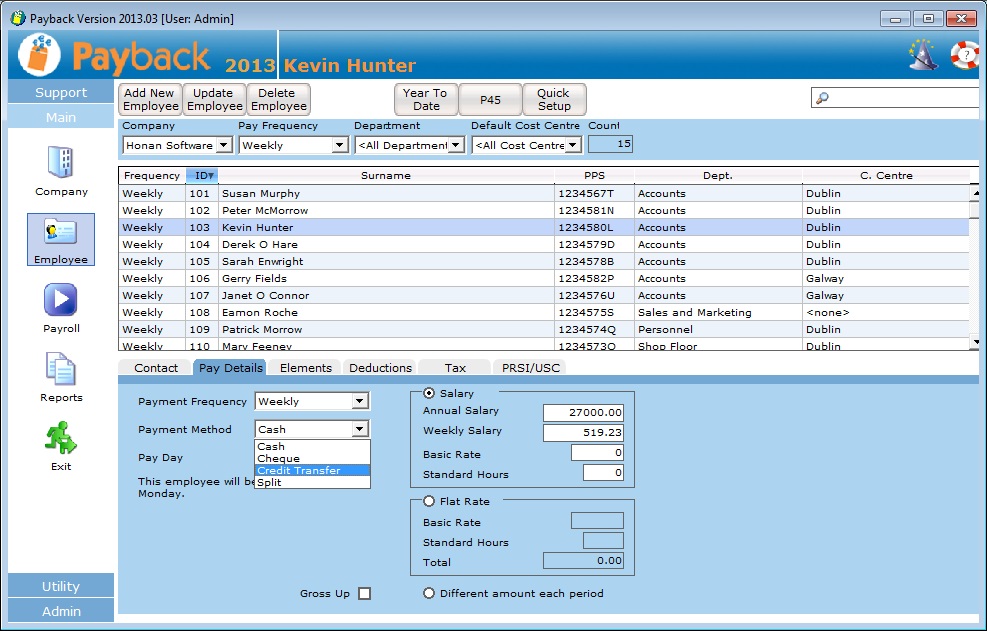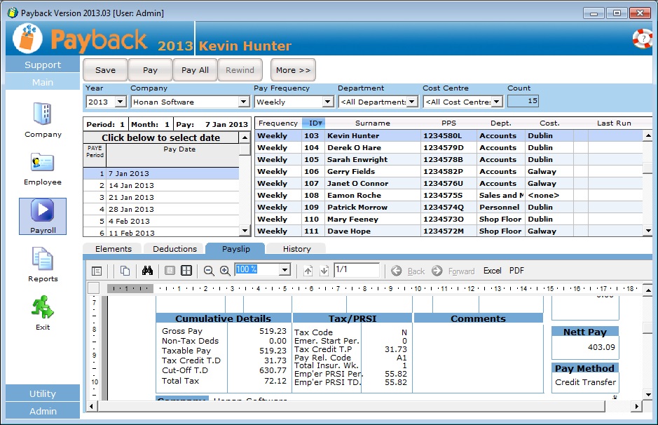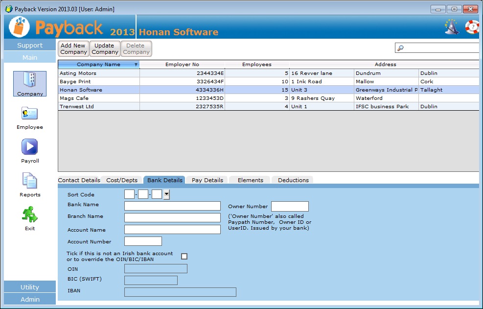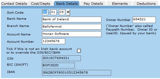 Step 1: Go to the Company screen and select the company you wish to use to make the payments. Then click the 'Bank Details' tab. Step 2: Enter the Bank Details for your company and click 'Update Company' at the top of the screen, when you are finished. All if these bank details can be obtained from your bank. Note that when you enter or select a Sort Code, the bank details associated with that Sort Code are automatically filled in. These can be over-written. The SEPA fields (OIN, BIC and IBAN) are automatically calculated from your bank details. You can also over-write these if they are incorrect, by ticking the override box. All of the fields must be correctly filled if you wish to pay by SEPA. Owner Number: This is also called 'Paypath number, Owner ID or User ID. It is 6 digits long, and if you currently use Paypath to pay your employees you may already have filled this in. OIN (Originator Identification Number): This is a 13 digit code, automatically calculated from the 'Owner Number', if the override box is not ticked. BIC or SWIFT (Business Identifier Code): 8 or 11 characters that identify your bank. IBAN (International Bank Account Number): This can be up to 34 characters long, and is calculated from the BIC, sort code and account number. Step 3: Bank details should now be entered for each employee that you wish to pay using SEPA. To do this, go to the employee screen and select the employee. Click on the 'Pay Details' tab and select 'Credit Transfer'. (Note that in older versions of Payback, this option was called 'Paypath'. Now both SEPA and Paypath are paid with a pay method of 'Credit Transfer'.) A new 'Bank' tab will appear in the employee screen Step 4: Enter the Bank details for each employee, and click 'Update Employee' at the top of the screen. Like in the Company screen, the BIC and IBAN are automatically calculated, but can be over-written by ticking the override box. Step 5: Process the pay for your employees in the Payroll screen. Make sure that the payment method on the payslips is 'Credit Transfer'. If you already processed the employee with a different payment method (Like 'Cash' or 'Cheque') you will have to rewind and then re-process the payment to pay with credit transfer. Step 6: Produce the SEPA XML file. Go to the reports screen and select 'SEPA Credit Transfer'. Click 'Preview Report. The SEPA payment screen will appear with all the employees with payment method of 'Credit Transfer' displayed in the grid. (Note that this screen can be resized.) If there are any red error messages these must be fixed before the file can be created. When you are ready to create the file, click the 'Save' button in the SEPA screen. You will be prompted for a location to save your SEPA XML credit transfer file. Once you have done this, you can send the file to your bank for processing.