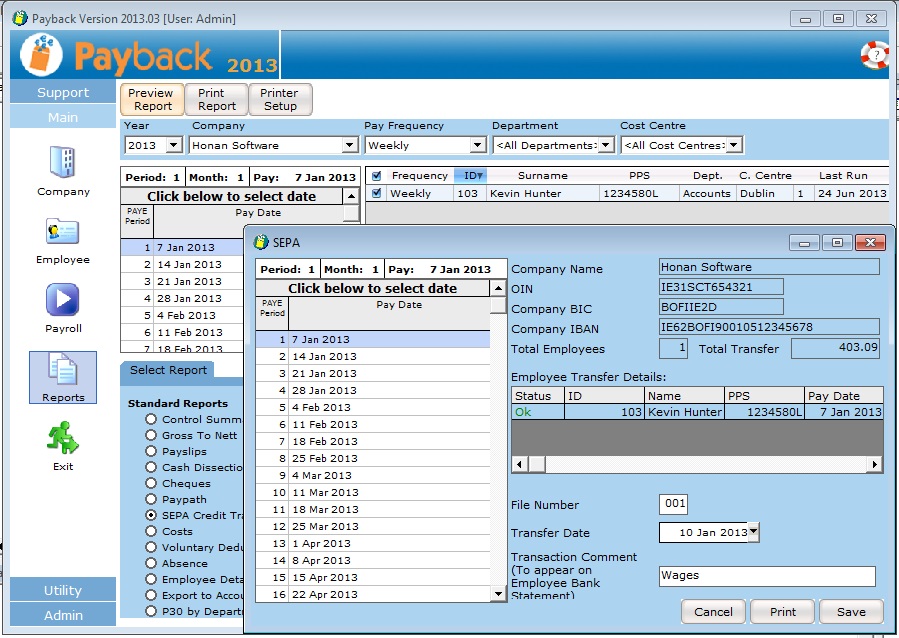 A SEPA (Single Euro Payments Area) credit transfer file allows you to transfer wages payments directly from your company bank account to your employees accounts. It takes the form of a file you generate from Payback and then upload to your bank for processing. Version 2013.03 onwards of Payback allows SEPA files to be created. Please make sure you are running at least version 2013.03. SEPA is being phased in by the Banks during 2013. However, many banks will still be accepting the Standard 18 format (Paypath) into 2014. |